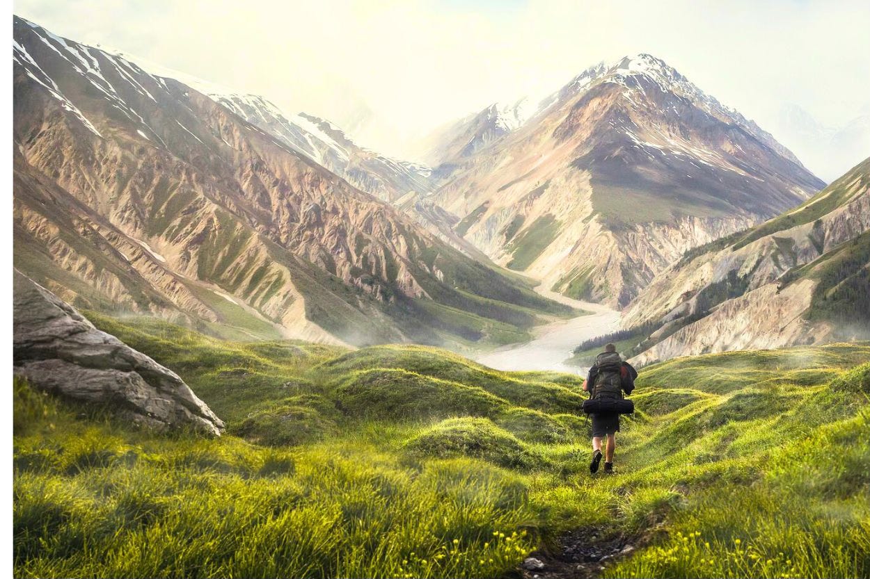 Nearby a mountain trail climbs toward a summit that pulls at something deeper, the sense that the view from up there would change how you see everything below.